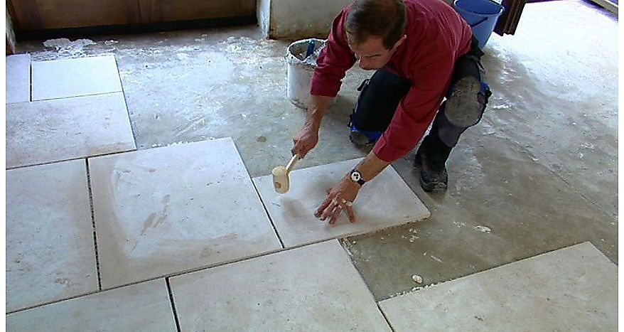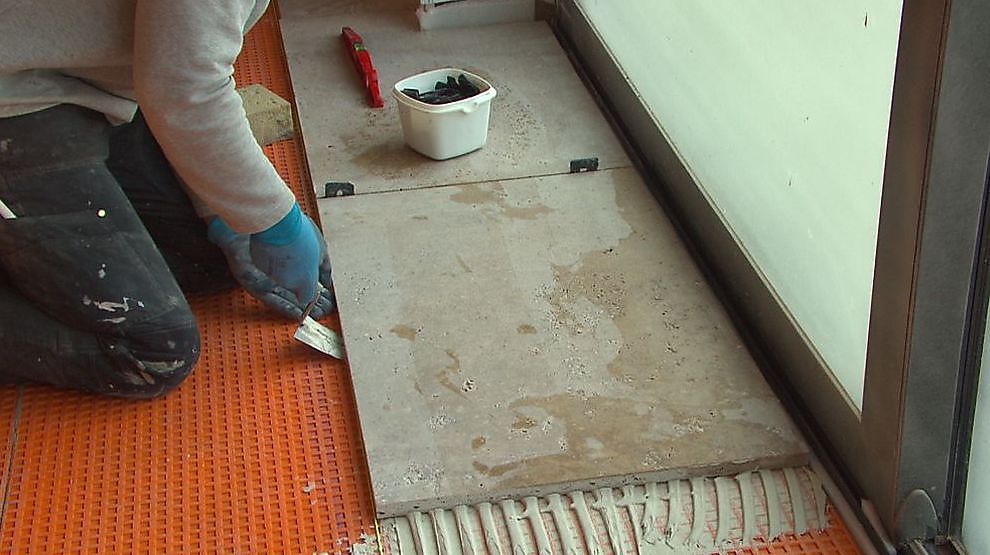 Het zelfbouwhuis - aflevering 57 Vloerafwerking: vloer betegelen - Ep. 57 - In de vorige aflevering plaatsten we ontkoppelingsmatten om de vormveranderingen van onze chape - onder invloed van de vloerverwarming - op te vangen. Nu kunnen we aan de laatste fase van onze vloerafwerking beginnen: het vloeren. We bedekken de gelegde ontkoppelingsmatten met natuursteentegels. Maar voor we er aan beginnen, denken we goed na over de positie en het patroon, zodat we tijdens het tegelen niet voor verrassingen komen te staan. Eens de vloer betegeld en opgevoegd is, werken we ook de trap en de plinten af in natuursteen.